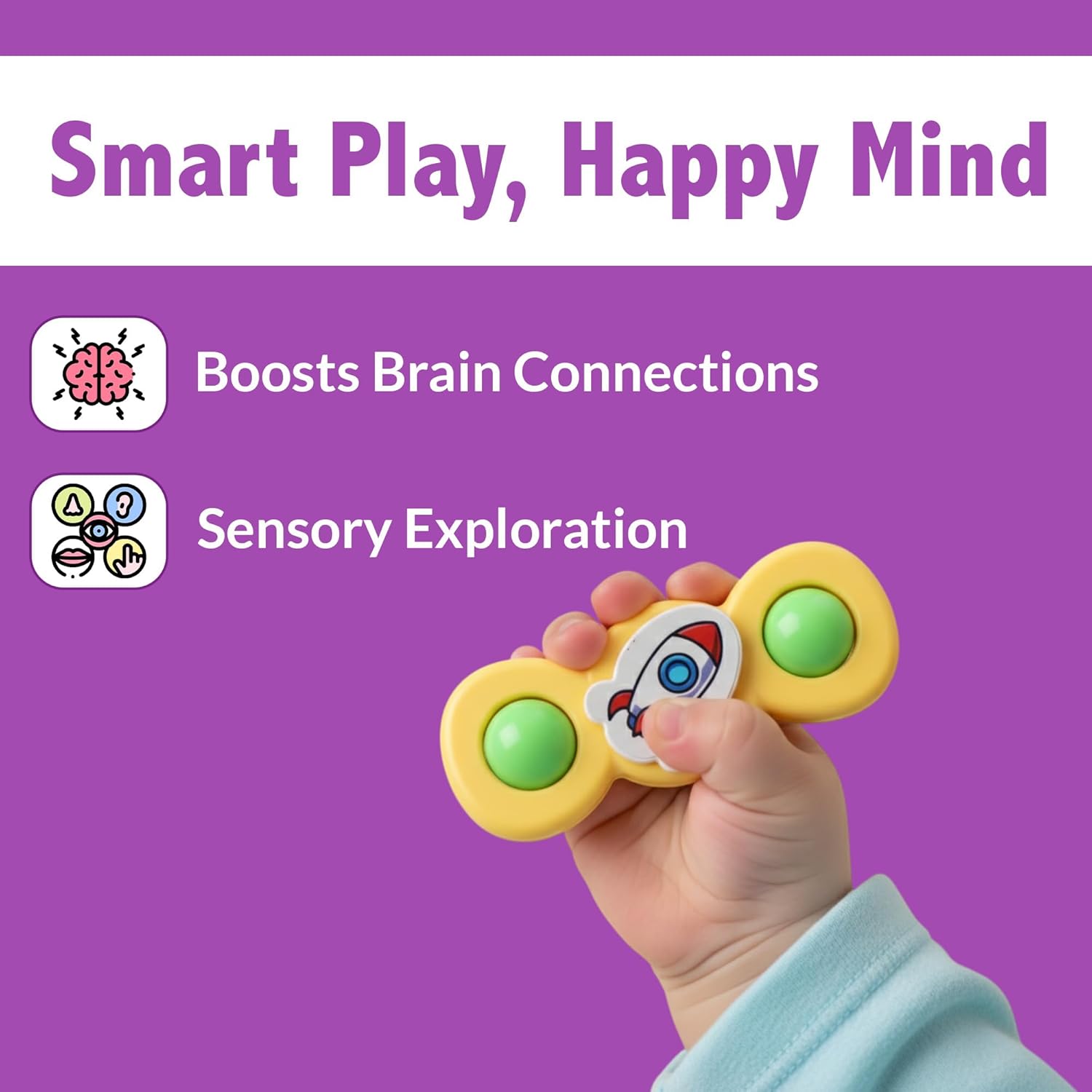 Equipped with a strong suction cup base, these spinners easily attach to high chairs, floors, tables, tiles, and bathtubs, making them perfect for multi-surface play. Their engaging shapes, tactile buttons, and spinning motion help improve hand–eye coordination, focus, and curiosity in infants.