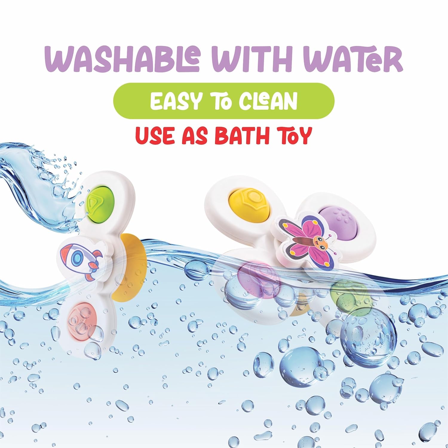 Ideal for high-chair entertainment, tummy time, and bath-time fun.