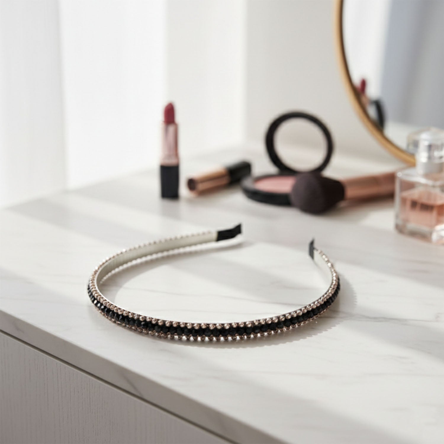 Add a classy sparkle to your hairstyle with this Elegant Black Crystal Studded Hair Band, designed to give a premium and polished look in seconds. This stylish headband features a sleek metal base with neatly arranged black and crystal stones that create a rich and fashionable finish. It helps keep hair perfectly in place while adding a glamorous touch to your overall appearance. The lightweight yet sturdy design ensures comfortable wear for long hours without slipping, making it suitable for both everyday use and special occasions. Whether you are dressing up for a wedding function, party, festive celebration, or simply want a stylish accessory for daily wear, this decorative hair band is a perfect choice.