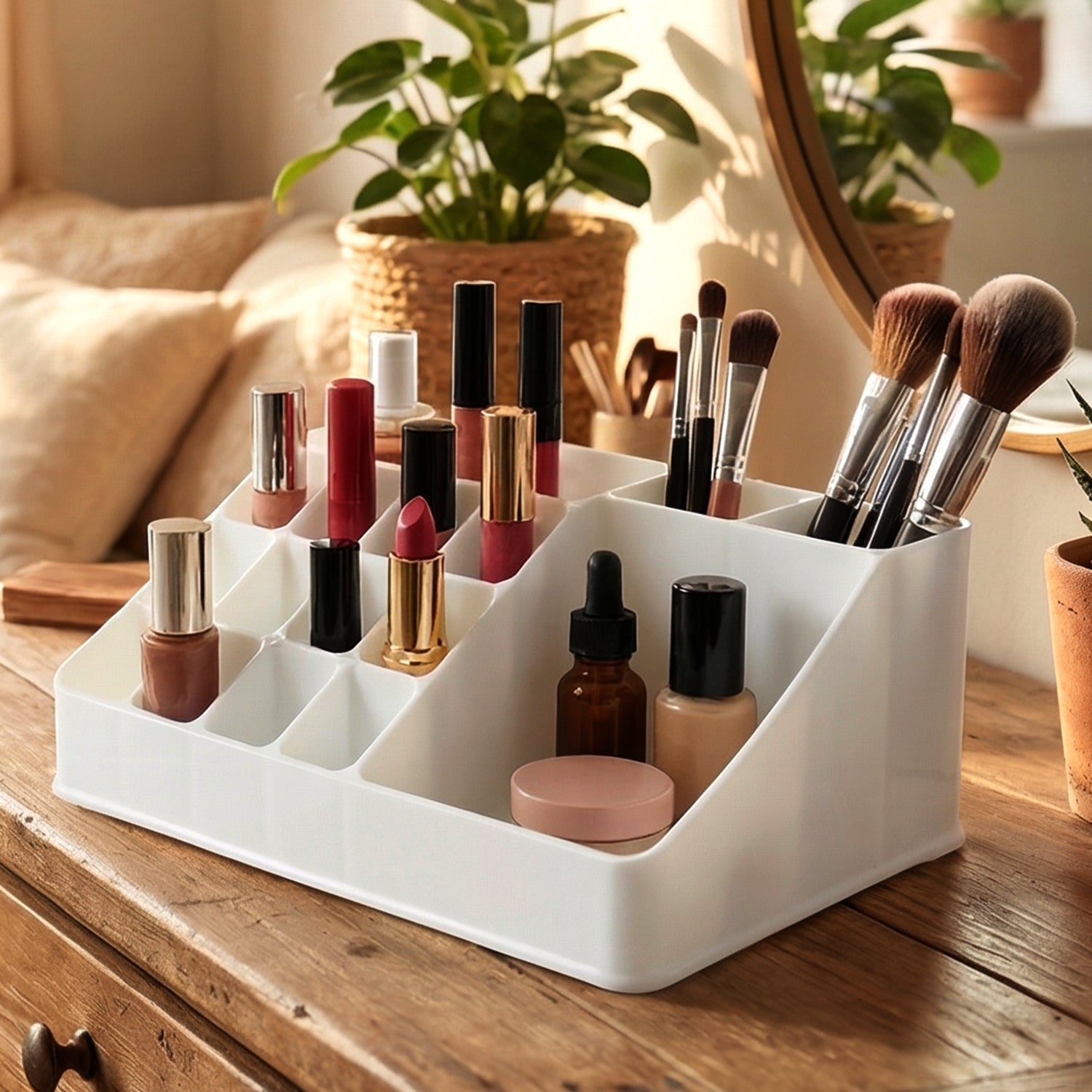 This multipurpose makeup organizer storage box is designed to keep cosmetics and beauty accessories neatly arranged in one convenient place. The multi-compartment layout allows organized storage of lipsticks, nail polishes, makeup brushes, skincare bottles, and other beauty essentials. Its practical design helps keep dressing tables, bathroom counters, or vanity areas tidy while making everyday makeup items easily accessible. The spacious sections provide enough room to store different types of cosmetics without clutter. Ideal for daily beauty routines, this organizer helps maintain a clean and well-organized makeup space.